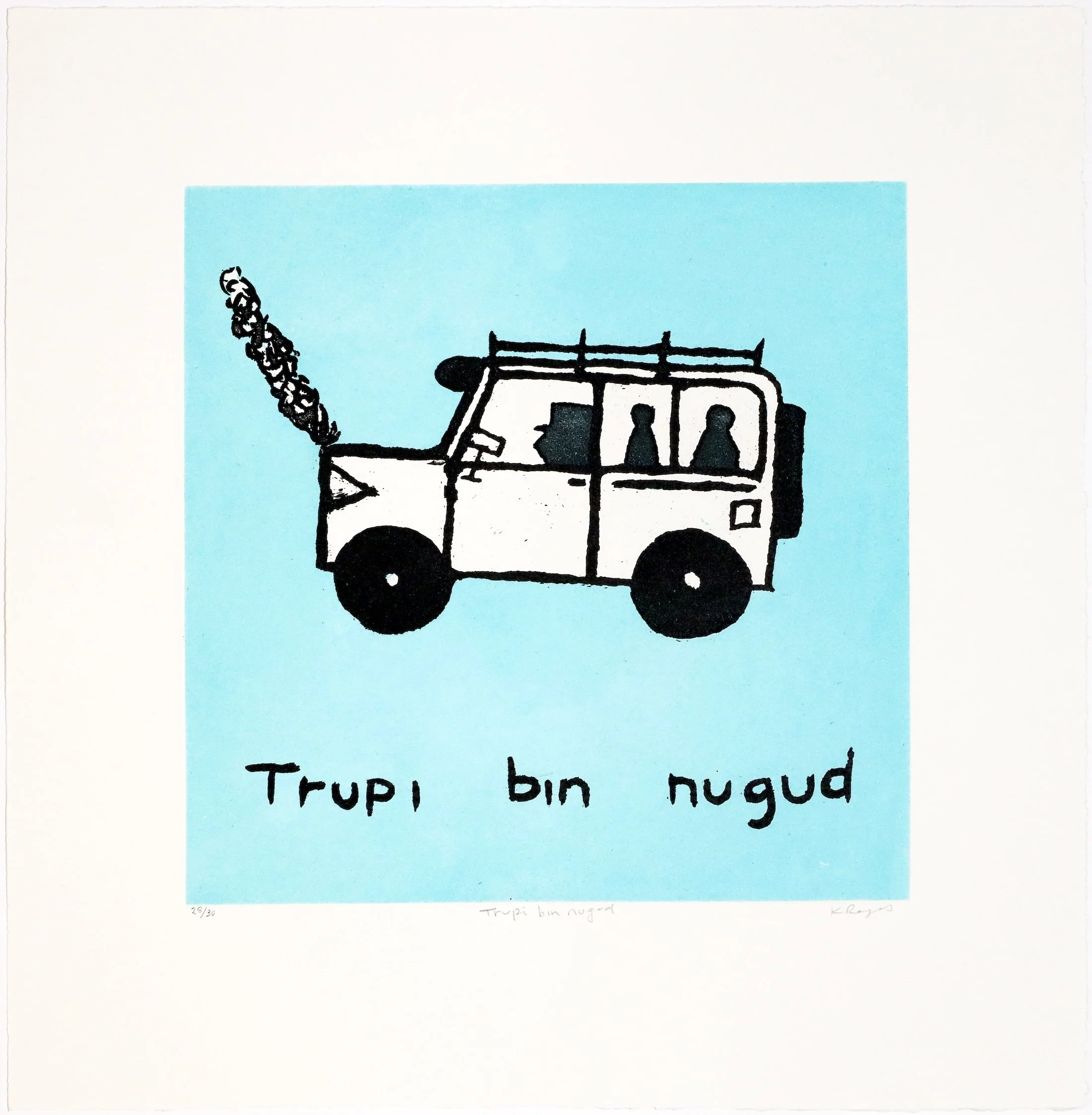 Karen Rogers, Troopy Story – Trupi bin Nugud 84_25, 2025, colour linocut, 45 x 45 cm.