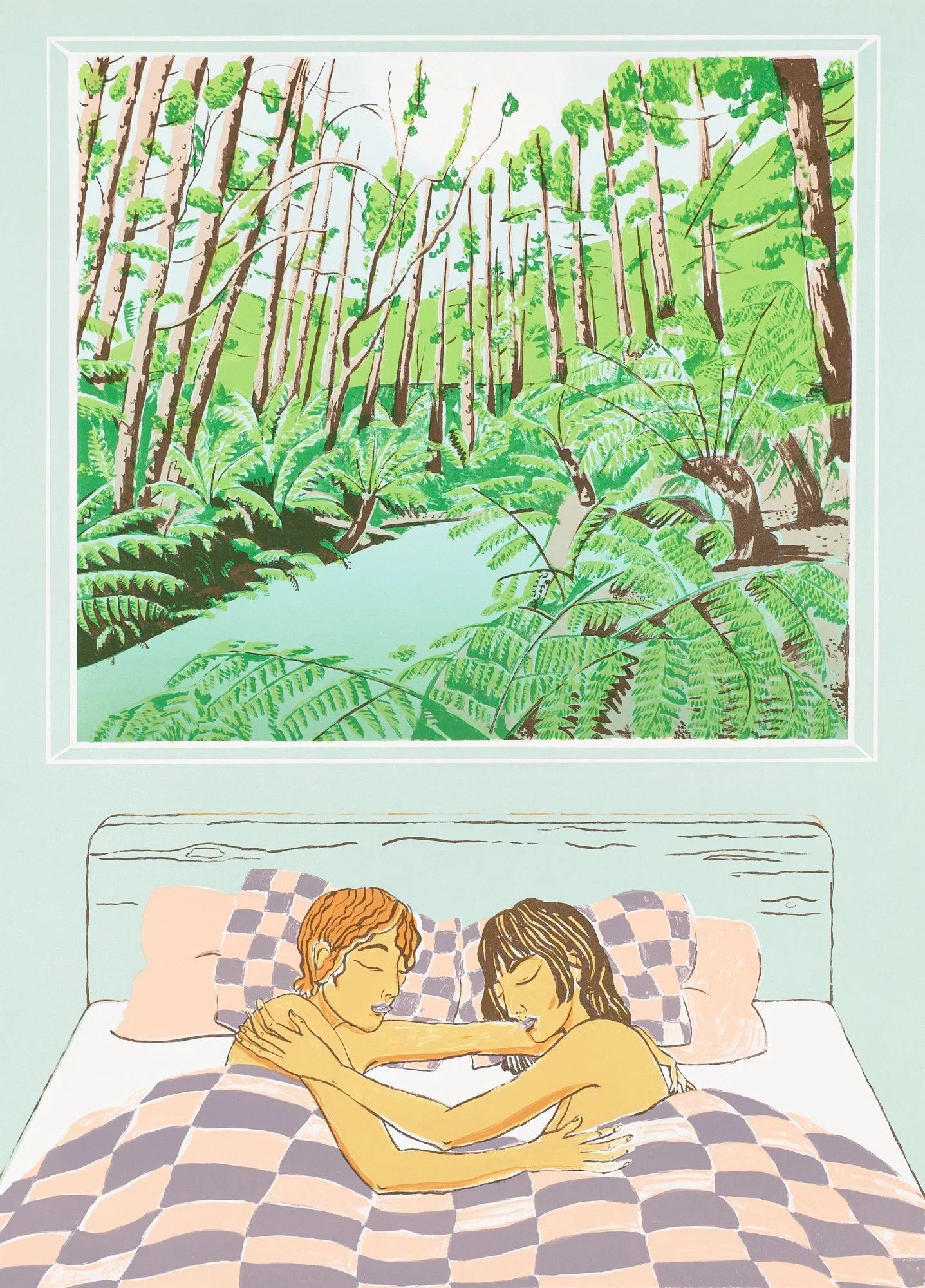 Rob McHaffie, While We Rest the Forest Grows, 2025 lithograph, 73.5 x 52.5 cm. Printer: Sunshine Editions.